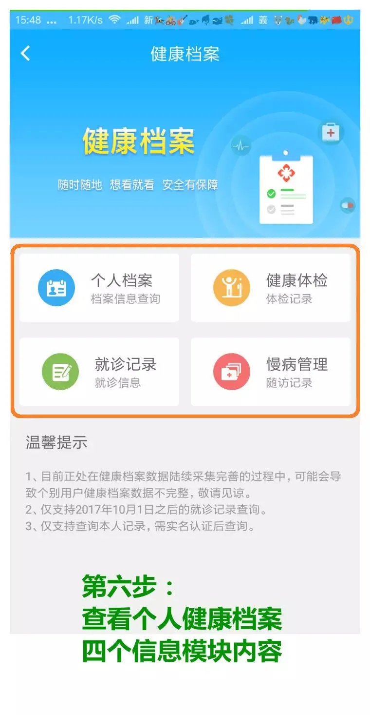 *健康体检记录、就诊记录、慢病随访记录是根据您于2017年10月1日之后,所接受过的门诊、住院检查记录,以及社区慢病随访管理记录等信息。