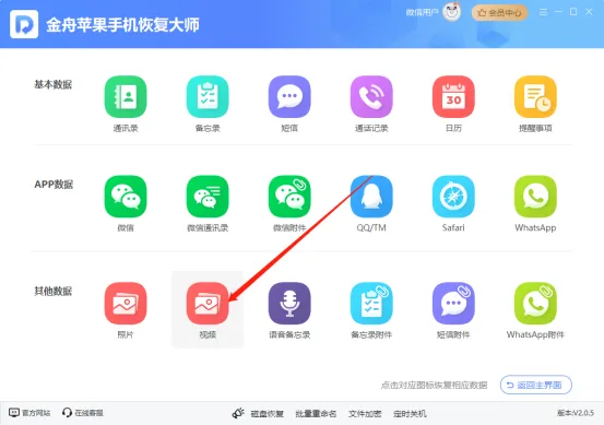 步骤3:根据需要,选择需要恢复的内容,这里点击“视频”;
