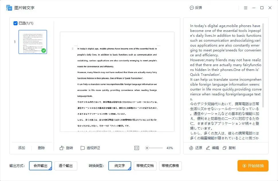 软件会自动识别图片中的文字,并将其转换为可编辑的文本,提供多种语言,包括中文、英文、日文等,满足不同语言转换需求。