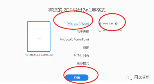 之后出现到如下界面,可以导成多种格式,此处我们只转化成Word文档,所以我们直接选择导出就可以,如果你需要导入其他格式的,可以灵活选择下面的格式,有兴趣的自己操作,此处不做介绍。