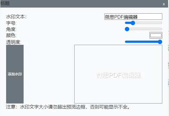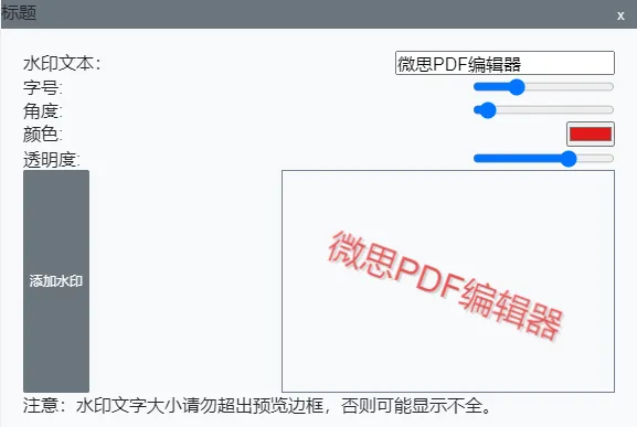 我们可以设置水印的角度、字号、颜色和透明度等,注意,预览框中的文字请不要超出预览框的范围,否则会导致裁剪和显示不全。