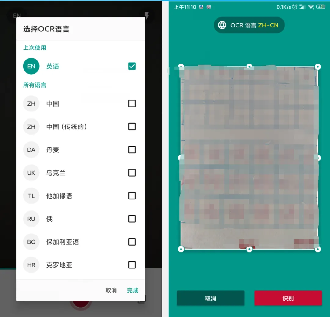 识别时没有网络,其识别率也很高。选择语言后,进行拍照识别,可以拖动周围的小圈圈来调整位置,尽量将与文字无关的元素切掉,