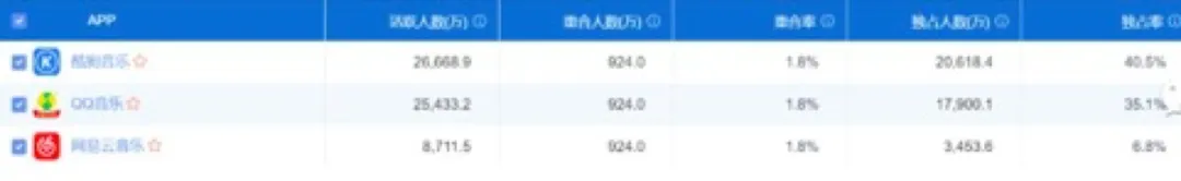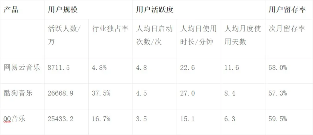 们可以看到,网易云音乐在用户活跃度 3 个指标的表现都还不错,从人均日启动次数来看, 三款产品不相上下,都满足用户最基本的音乐需求。