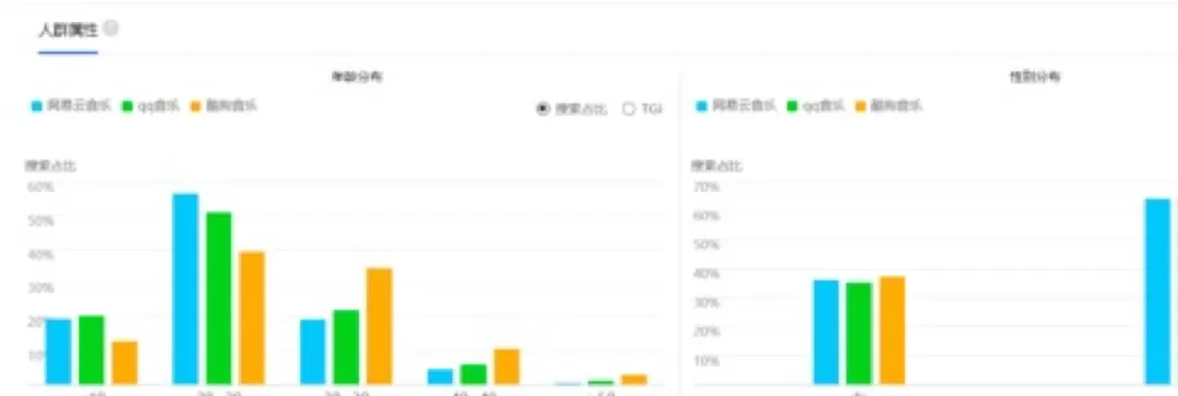 对于酷狗音乐来说,K 歌功能提高了爱唱歌用户的使用时长,而 QQ 音乐的用户听歌比较有目的性,与热门歌手、热门综艺等有较大的关系。最后用户留存率方面,三款产品不相上下,都在 50%~60%,可见每款产品都满足了自己用户的大部分需求,超半数用户是喜欢自家产品的。