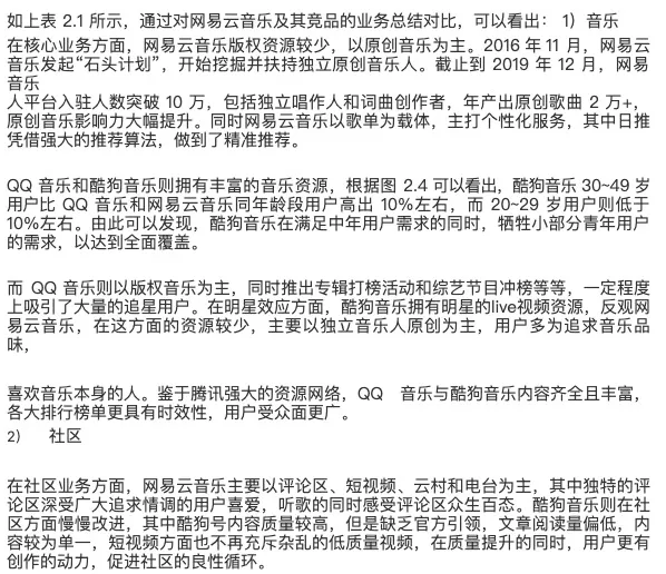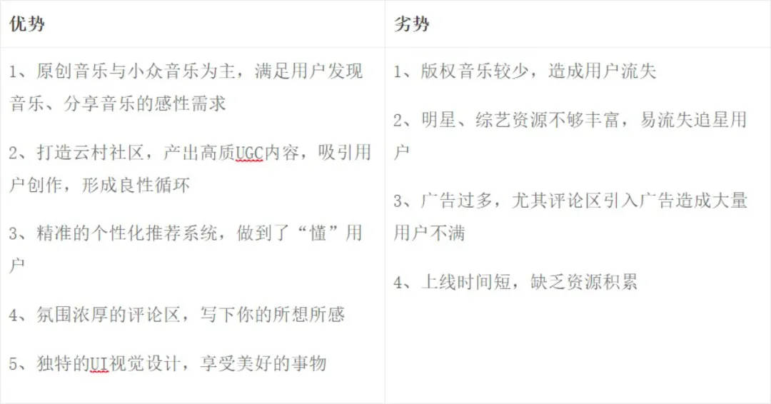 如上表 2.4 所列,简单分析总结了网易云音乐的优势和劣势: