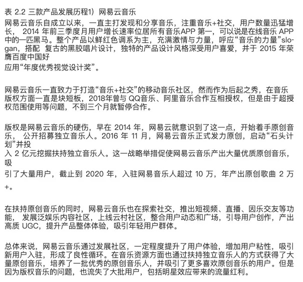 网易云音乐主打音乐+社交,在扶持独立音乐人获得大量原创音乐的同时,不断改进云村社区,引导用户创作,产出高质 UGC 内容,在“音乐”和“社交”这两个方面,做到了满足用户发现新音乐、原创音乐、小众音乐并分享音乐的感性需求,不再是单纯的大众熟知的版权音乐。