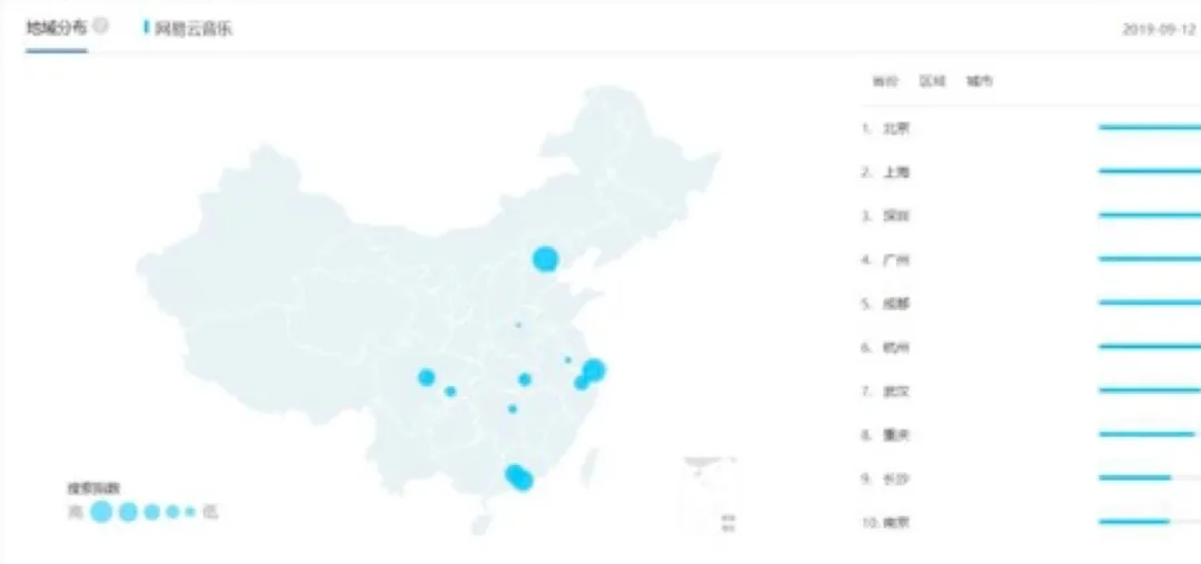 根据百度指数近半年数据显示,网易云音乐用户主要分布在北上广深、成都、杭州等一二线城市,以华东、华南、华中为主要地区,这和沿海及周边省份的发展相关,这些地区互联网发展较快,前沿资讯获取相对便捷,用户消费水平也相对较高,对于网易云音乐推出的各类付费服务更具有购买力。