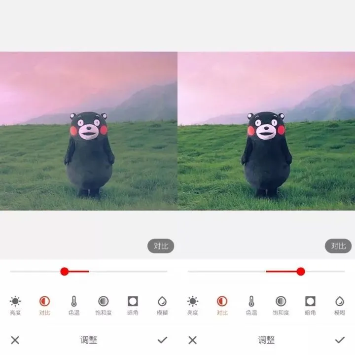 很明显就能看出左边在对比度比较低的情况下,熊本熊的黑色会淡很多,而右边的黑色则会明显很多,显得熊本熊更熊本熊一些。