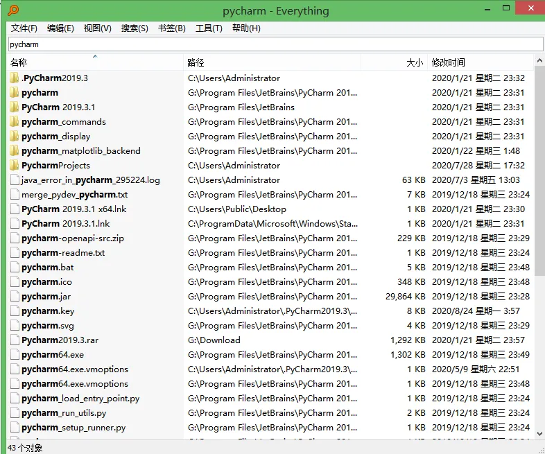 最近发现了一个特别好用的软件,它的名字叫做everything(适用系统:windows),它能够帮助你快速检索定位你电脑中的某个文件,只要你还记得文件名或者部分文件名,就像这样