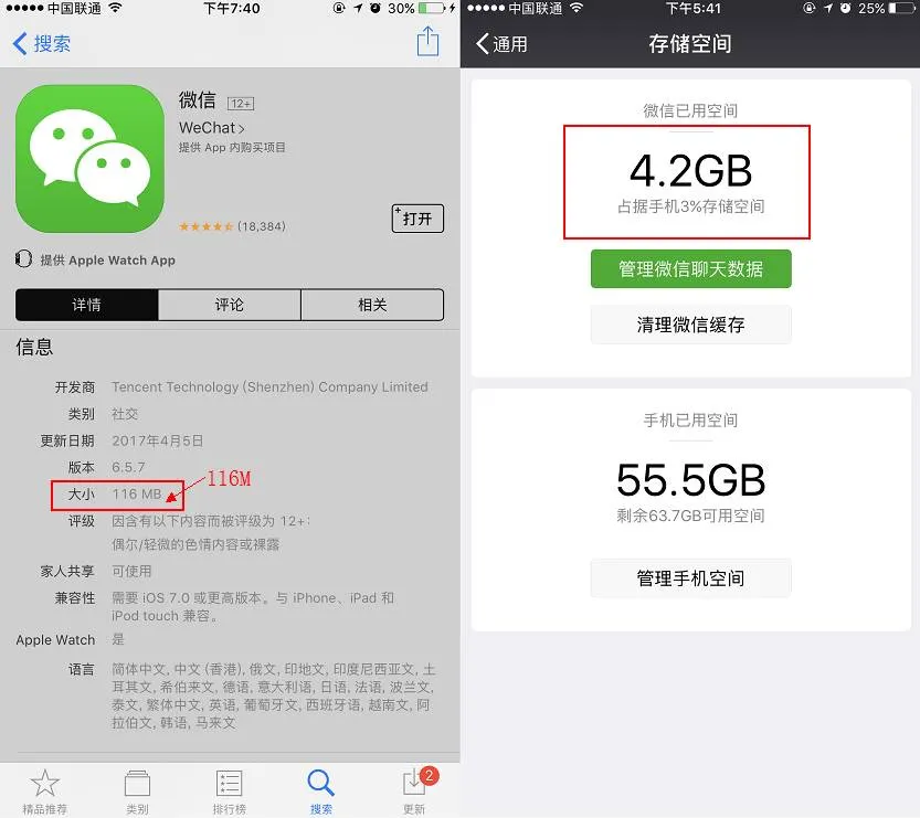 下载的时候明明是116 M,用了一段时间后再看微信已用空间就特么变成了 4.2 G。