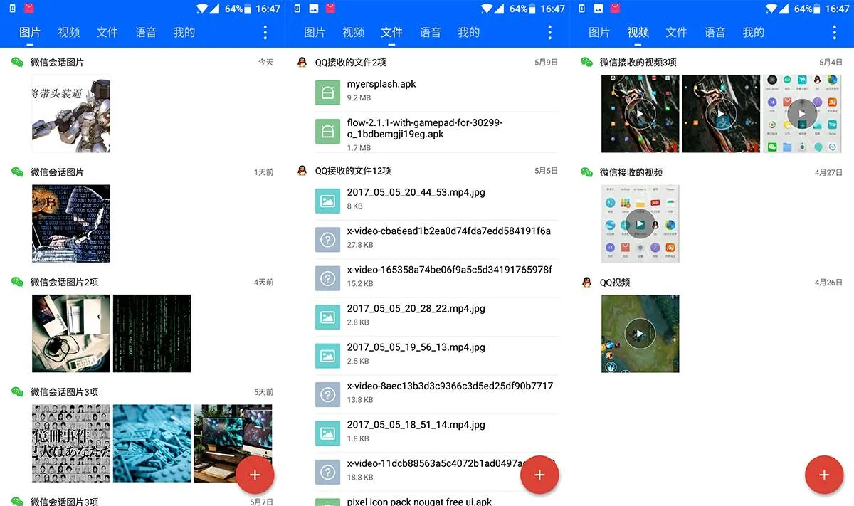 打开微痕迹后,你会发现这三款App(主要是微信和QQ)的所有缓存都被分为了图片、视频、音频和文件这几类存放,而且所有文件都是按照日期排序~