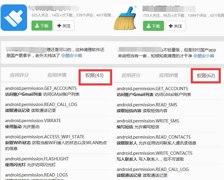 可以给你们看看国内某两款清理软件需要获取的手机权限。