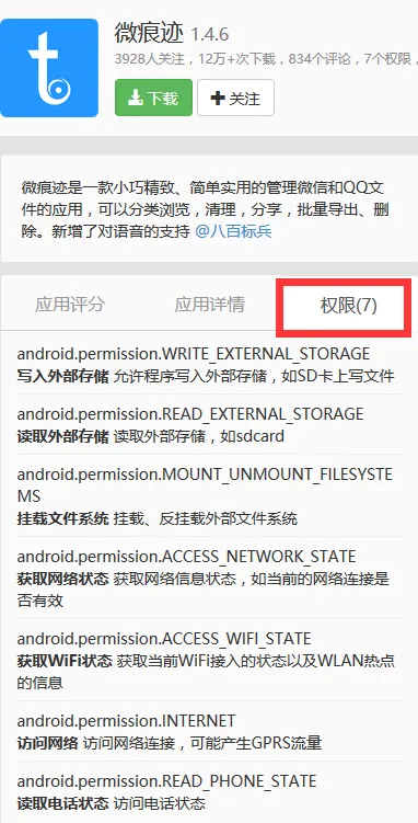 再看看微痕迹,它需要获取的权限只有7个,基本上都是清理功能中必须的一些权限~