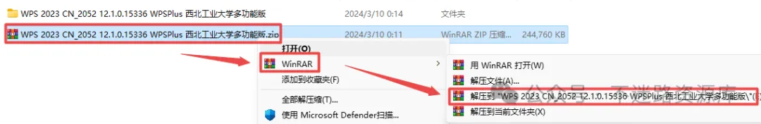 1.选中下载的压缩包,然后鼠标右键选择解压到“WPS 2023 CN_2052 12.1.0.15336 WPSPlus 西北工业大学多功能版“(没有解压选项点这里)