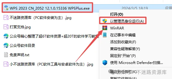 2.打开刚刚解压的文件夹,鼠标右键点击“WPS 2023 CN_2052 12.1.0.15336 WPSPlus.exe”选择“以管理员身份运行”