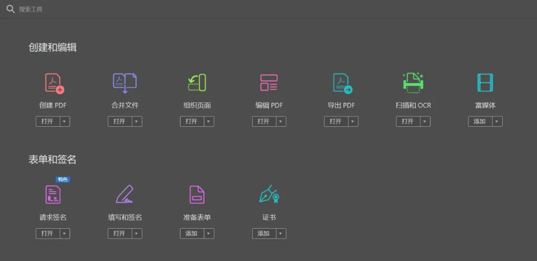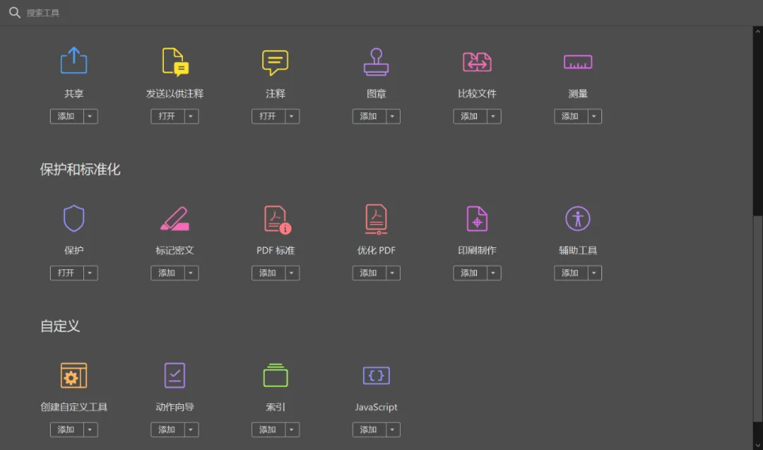压缩pdf文件大小、创建pdf、编辑pdf、导出pdf、注释、组织页面、增强扫描、保护、准备表单、合并文件、优化pdf、标记密文、图章、比较文档、发送以供注释、动作向导、创建自定义工具、印刷制作、pdf标准、证书、辅助工具、富媒体、javsscript、索引、测量……