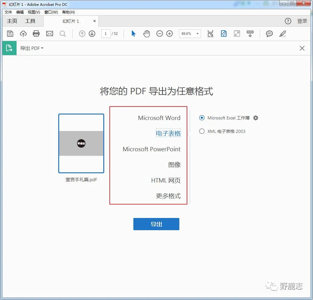 选择导出pdf,这里可以选择你想要导出的格式类型,word、ppt、excel都可以: