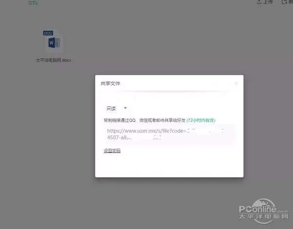 Uzer云盘里保存的文件可以分享给他人,可设置访问密码,可设置是否只读。
