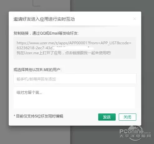 Uzer支持多人协作模式,用户可以通过链接形式邀请他人一起协作编辑文档,目前支持5人同时协作。有成员加入文档协作时,在左下角会有对应的成员标识,用户还可通过聊天对话框进行聊天沟通。