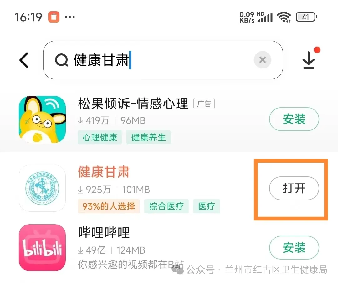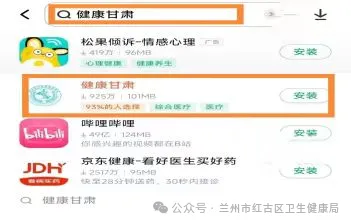 1.【下载并安装健康甘肃APP】 手机应用商店搜索【健康甘肃】点击【安装】