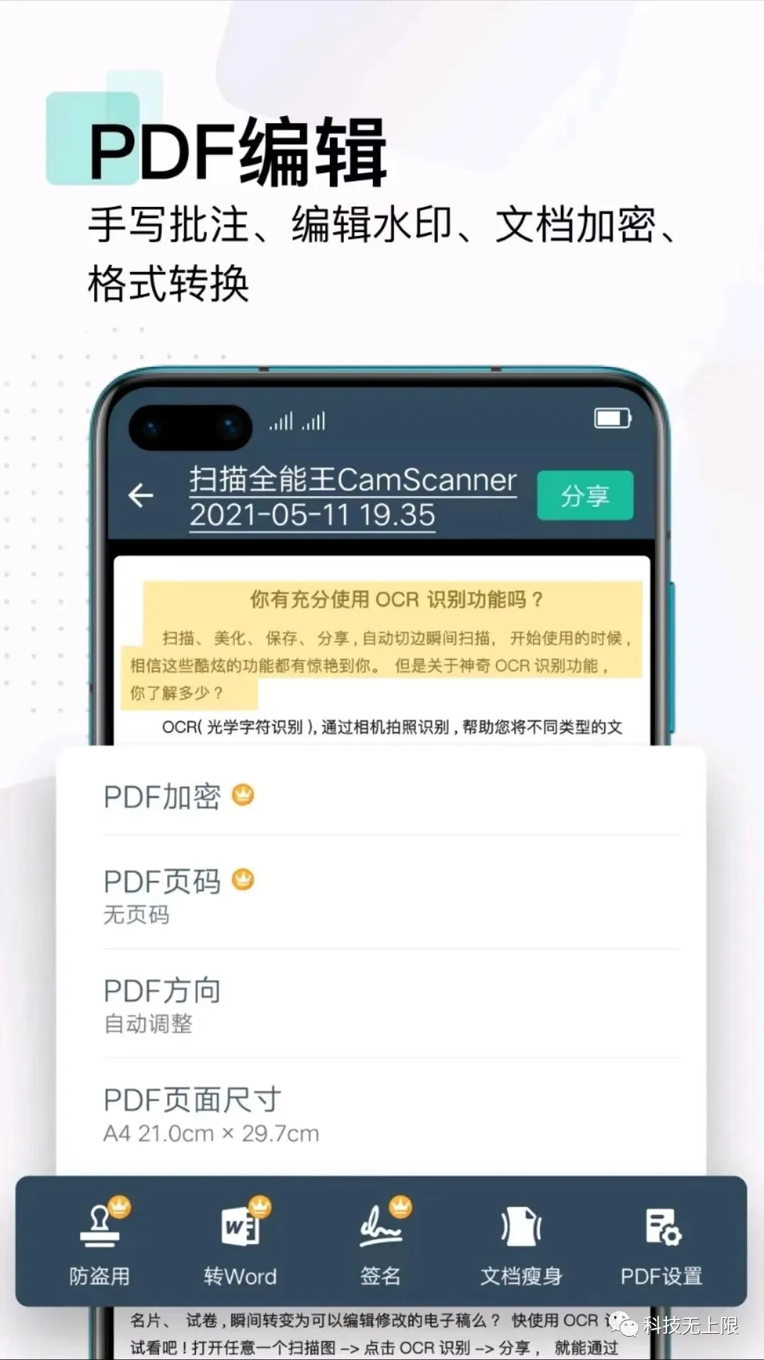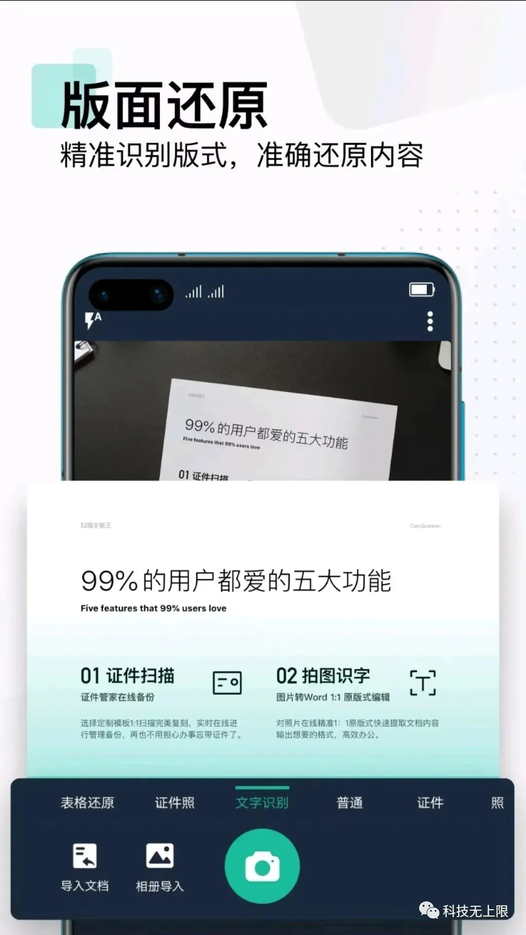 它还提供手机扫描仪功能,可以将任何拍摄的文件保存为PDF格式,支持多页PDF选项和文本识别功能。