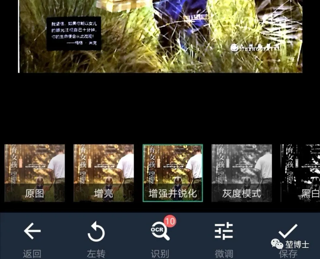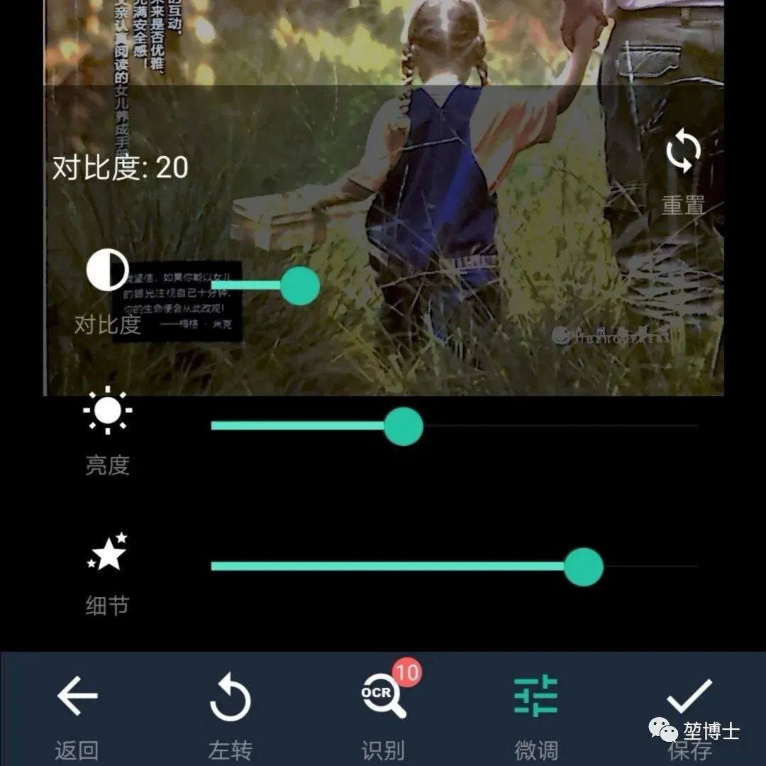 切边后,还可以选择原图、增亮、增亮并锐化、黑白、灰度等图像处理模式,并决定是否锐化,增加对比度、亮度,调节细节。