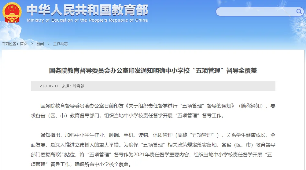 2021年6月教育部发布了“五项管理”文件,对于教学内容、手机使用、作业管理、睡眠管理、体质健康都做出了更多明确的规定。可以看出,促进学生身心健康全面发展,抵制题海战术,避免沉溺于手机,提升课堂效率是教育发展的方向。