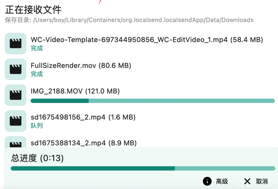 我特意找了一些大视频来测试速度,“嗖”的一下就传完了。