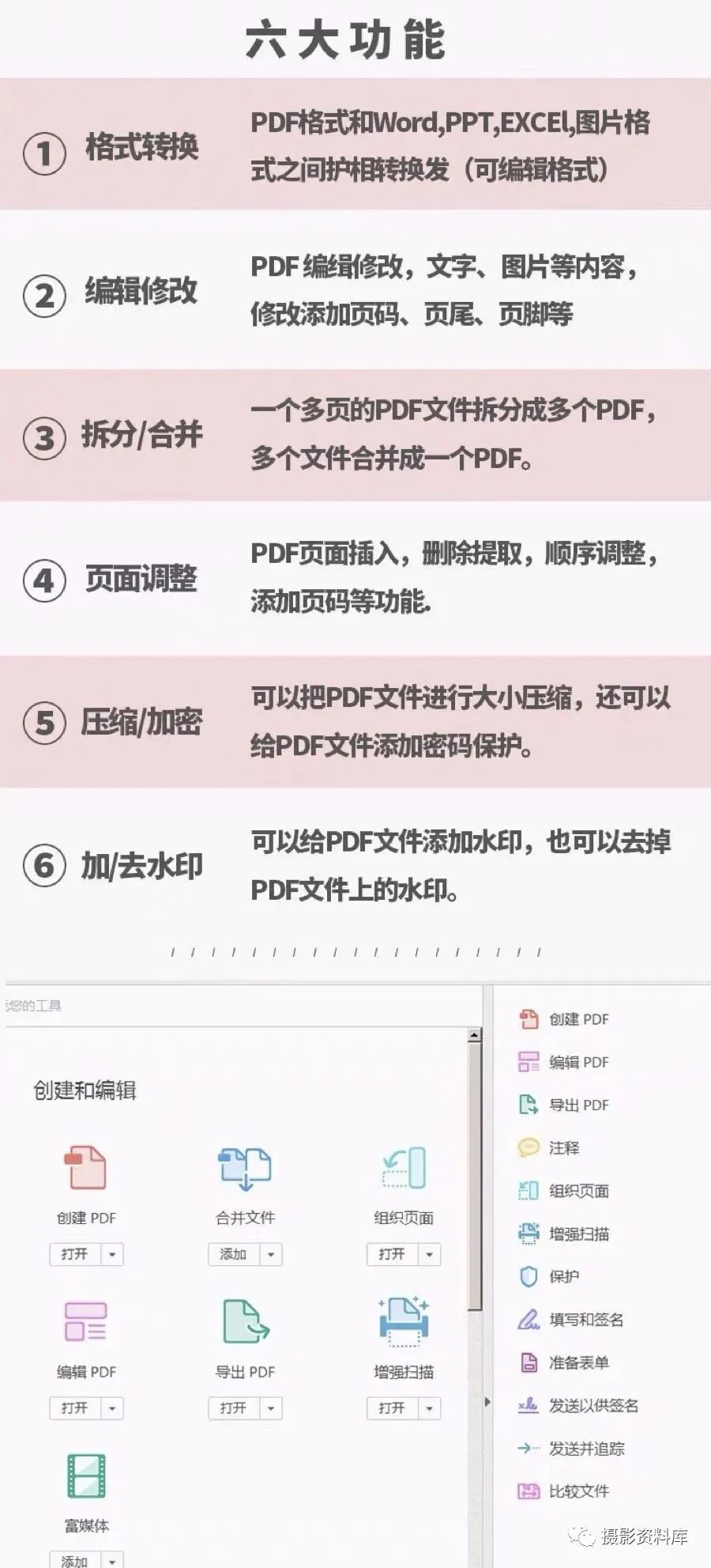 创建pdf、编辑pdf、导出pdf、注释、组织页面、增强扫描、保护、准备表单、合并文件、优化pdf、标记密文、图章、比较文档、发送以供注释、动作向导、创建自定义工具、印刷制作、pdf标准、证书、辅助工具、富媒体、javsscript、索引、测量等等