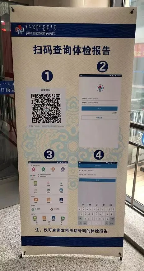 锡盟蒙医医院体检中心已开展手机APP查看体检报告新项目。来我院体检中心体检的人员只需下载锡盟蒙医医院APP,并提供姓名、性别、年龄及手机号码,即可在体检结束后通过手机APP查看个人体检结果,并支持完整、长期的保存,从而为体检人员查看各项记录及健康档案提供了便利。我院微信公众号也将在近期投入使用“查看体检报告”功能。