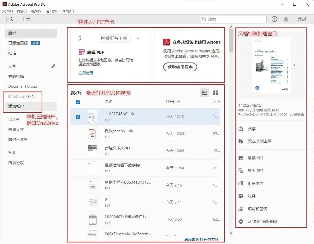 当没有打开 PDF 时,这是入口或登录页面。通过“主页”视图,可以快速访问最近打开的文件、共享的文件、常用工具、待办任务和存储帐户。