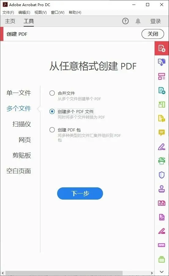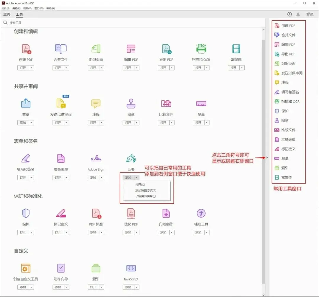 工具窗格:Acrobat 右侧窗格显示常用工具。