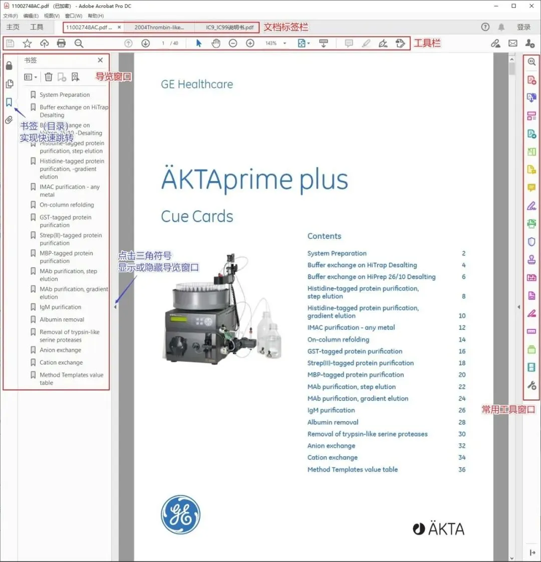 文档窗格显示 PDF。左侧的导览窗格有助于浏览整个 PDF 以及对 PDF 文件执行其它选项。靠近在窗口顶部的工具栏提供了可用于操作 PDF 的其它控制。