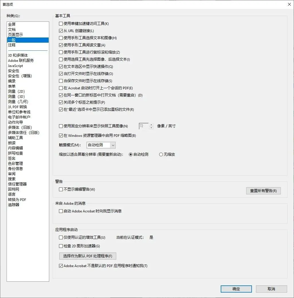 “首选项”对话框定义了默认的页面布局和用很多其它方法自定义您的应用程序。要查看 PDF,请检查文档、全屏、一般、页面显示和 3D 和多媒体首选项中的选项。