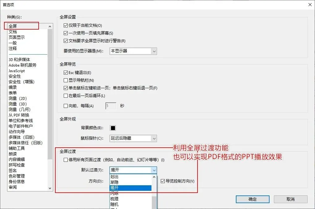 全屏模式时,可按“空格”“回车”键或“←,→,↑,↓”键或鼠标左右键来切换上一页或下一页,从而实现PDF格式的PPT文档播放。