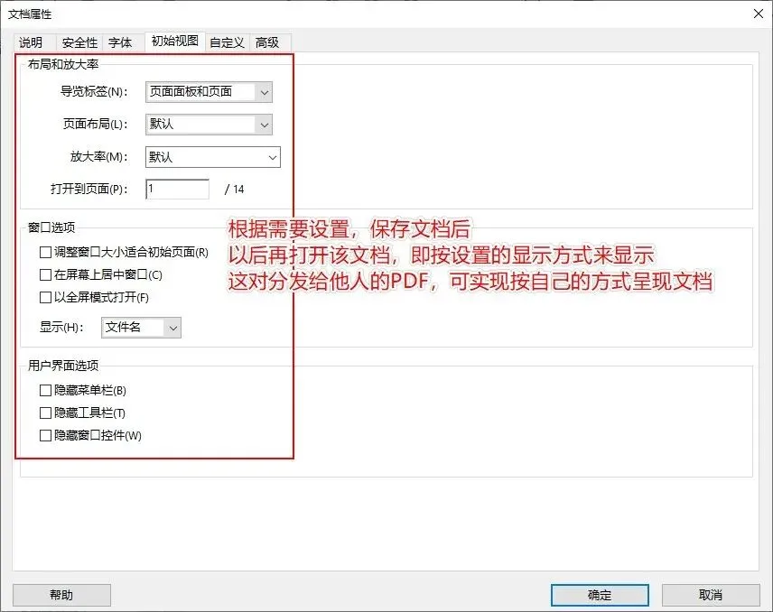 打开 PDF 文件时,显示的初始外观取决于创建者设置的文档属性。例如,文档可以在特定页面或放大率打开。