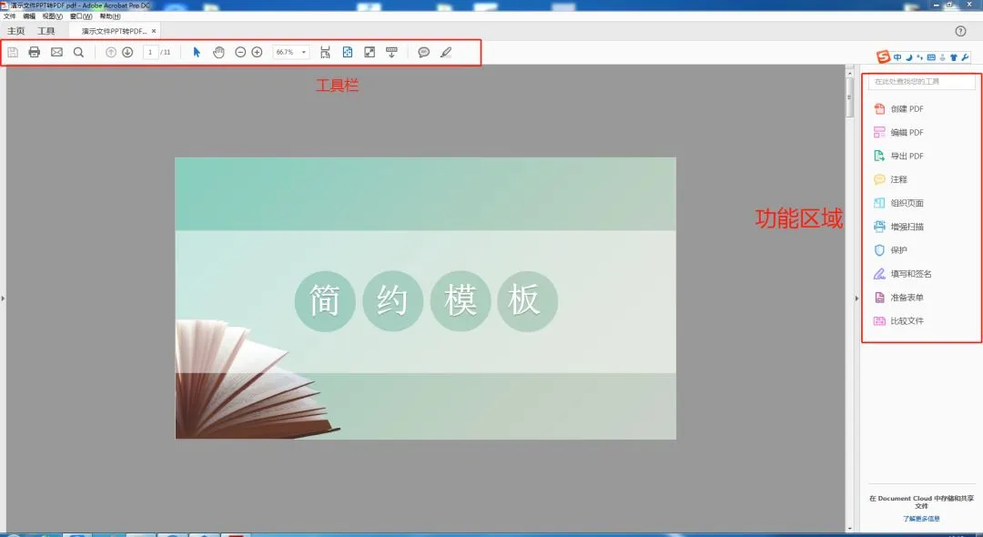 2.首先我就打开一个演示的PPT转换成PDF的文件,打开后呢,页面也是进入到工作版面,所以的编辑功能都列在右边,点击相应的功能区就能编辑PDF文件了。无论是字体修改,图片更换,注释标注,导出、导入、合并、拆分、转换等,Acrobat 可让Excel、Word和PDF之间的相互转化更为便利。你需要用到的功能基本都有。而且很容易上手。