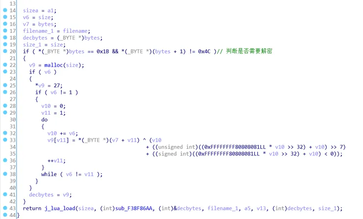 这个函数就是加载加密lua脚本的地方,其中对脚本进行了解密操作。根据第四个参数我们可以区分目前加载的lua脚本名称,从而选择性地dump(即在函数开头下断点,查看第四个参数内容)luaL_loadbufferx函数伪代码如下: