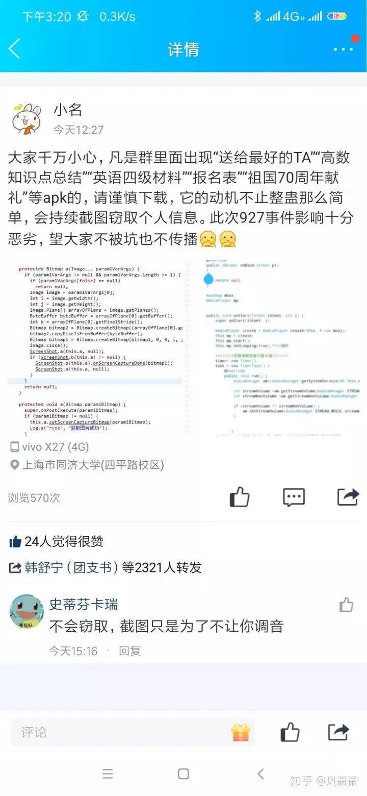 这件事传的沸沸扬扬,不少学生发帖声称自己被坑,更有人分析该APK文件可能是病毒软件,并窃取机主的私人信息。当然,目前为止并没有专业人士就此事发声,以上结论仍处在猜测阶段。