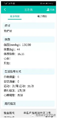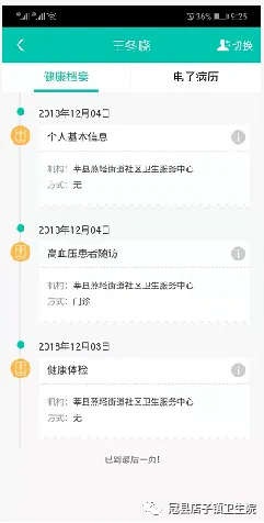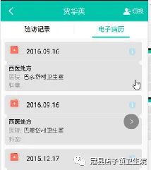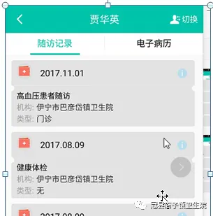 注意:这个地方仅限跟家庭医生系统做过对接的地区居民可以查看。点击具体的随访和电子病历记录可以查看里面的具体随访和病历内容。如下图所示: