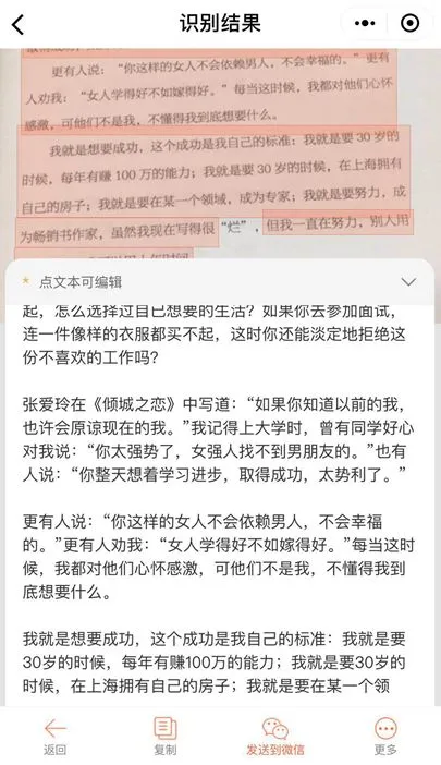相比于其他文字识别的工具,「拍图识字」这个小程序简直秒杀它们。没有断行,连容易出错的中文标点符号,都识别得很准确。