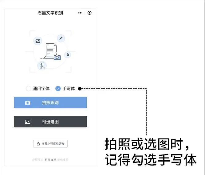 在微信中搜索「石墨文字识别」小程序,选择「手写体」,点击【拍照识别】,选择好识别区域后开始识别,很快就能出现识别结果啦。