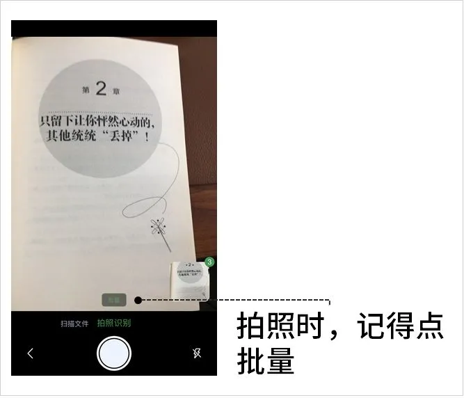 点击【相机】,在「拍照识别」页面点击【批量】,然后按快门连续拍照片即可,拍完后,点击右上方带有数字的微型相册。