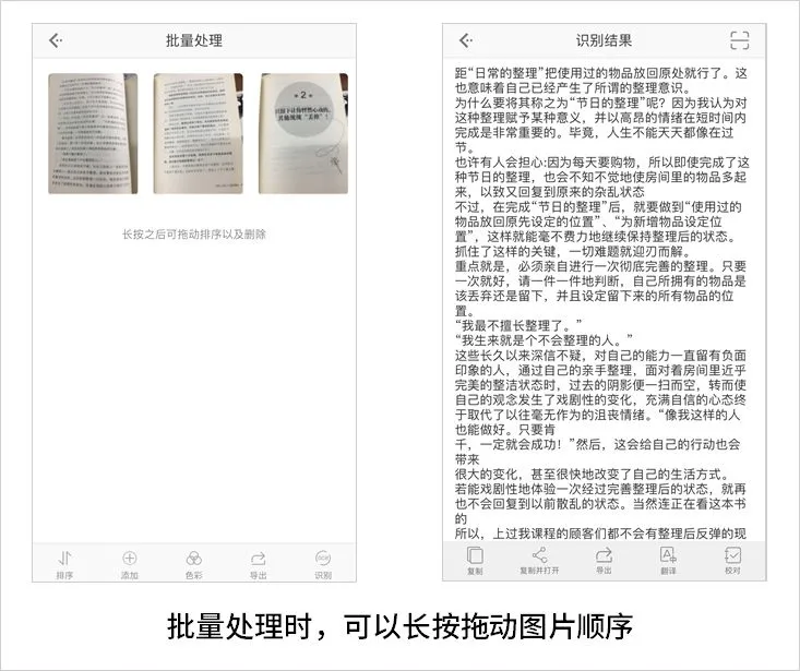 可以长按图片拖动排序,接着点击【识别】,等识别完成后,点击【识别结果】,所有文字识别结果都按顺序整合到一起啦。