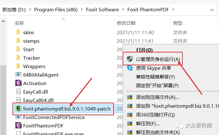 14.右键以管理员身份运行刚刚粘贴过来的foxit.phantompdf.biz.9.0.1.1049-patch程序;