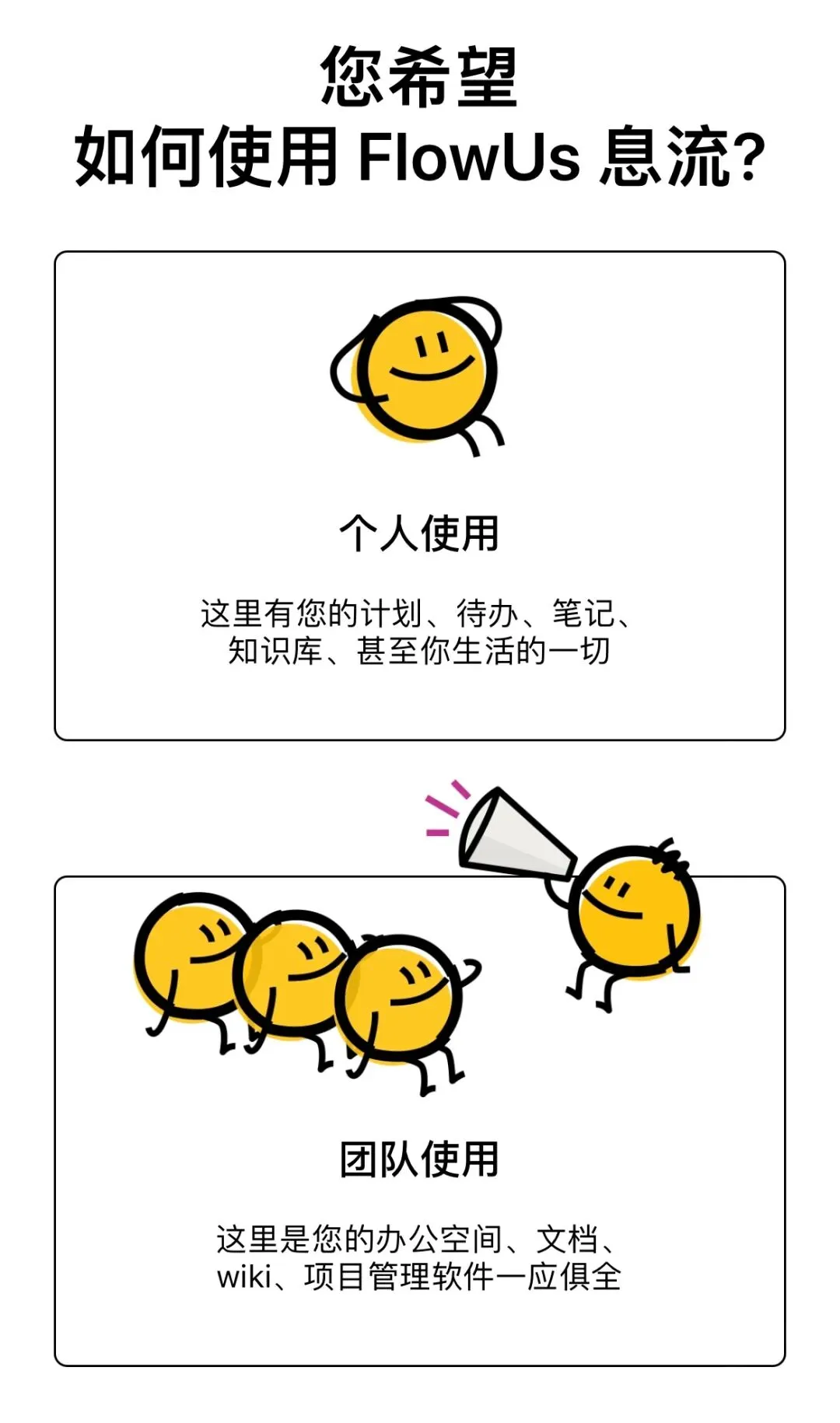其实在最开始登陆FlowUs的时候,会让你选择是个人使用还是团队使用,如果你选择了团队使用那就意味着你发现了FlowUs生产力隐藏属性。