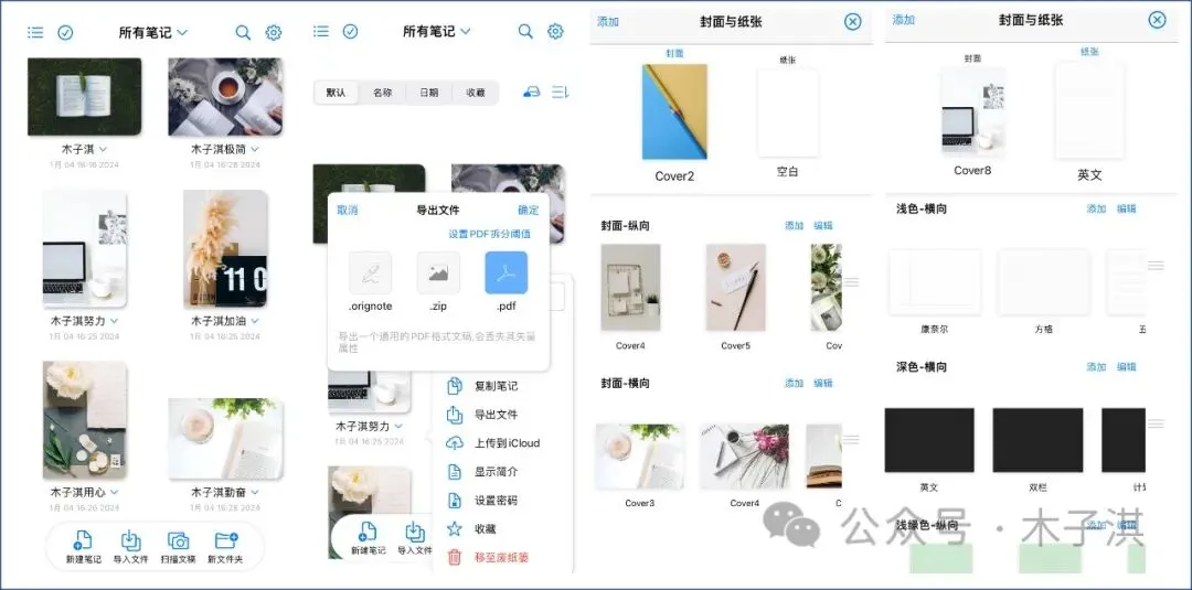 它支持新建笔记功能,提供了几十个好看的封面图片,包括纵向封面和横向封面,提供了多种不同尺寸、类型、颜色的纸张,包括:浅色、深色、浅绿色、横向、纵向、空白、点阵、英文、双栏、方格、计划表、康奈尔、五线谱,支持设置笔记名称和页数。