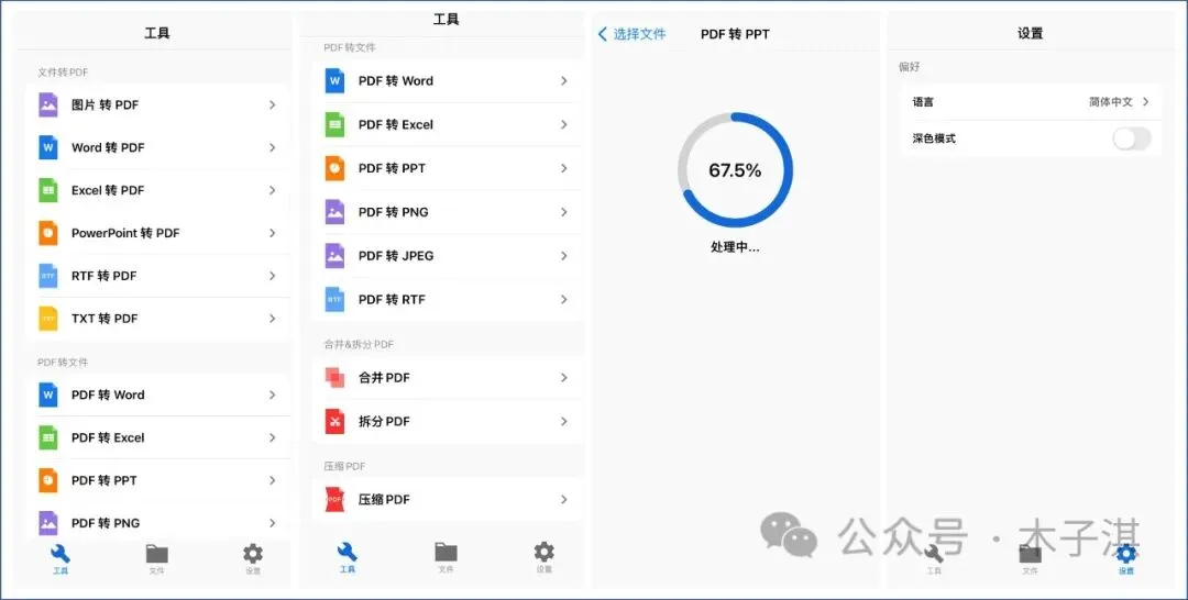 它支持的功能包括:Word 转 PDF 、Excel 转 PDF 、PPT 转 PDF 、图片转 PDF 、TXT 转 PDF 、RTF 转 PDF 、PDF 转 Word 、PDF 转 Excel 、PDF 转 PPT 、PDF 转 PNG 、PDF 转 JPEG 、PDF 转 RTF 、PDF 合并、PDF 拆分、PDF 压缩、PDF 文件管理,支持批量转换。