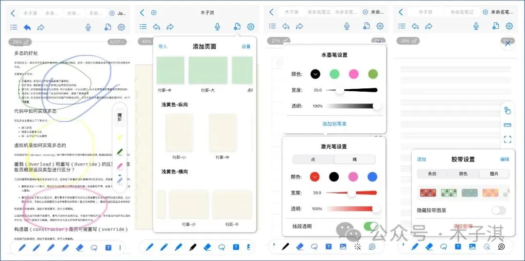 它拥有流畅书写体验,像在纸质笔记一样书写创作,支持独特的防误触和书写设置,支持多种笔刷,包括:画笔、圆珠笔、钢笔、铅笔、蜡笔、水墨笔、记号笔、单线笔、激光笔,支持设置颜色、宽度、透明。