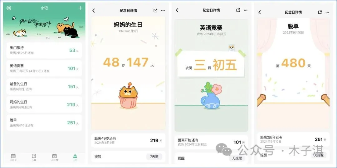 它的小记板块支持添加倒数日和纪念日,支持选择农历,支持设置提醒和备注。